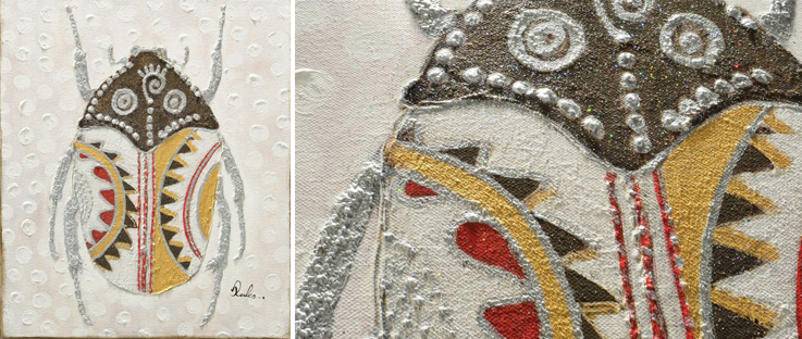 Skarabeus s výrazným etnickým vzorem v příjemných barvách, který vnese do vašeho interiéru nádech exotiky. Díky akrylovým barvám v kombinaci s dalšími materiály má obraz zajímavou strukturu s plastickým efektem. Akrylové barvy jsou známé svou stálobarevností, obraz vám tedy bude v nezměněné podobě krášlit interiér dlouhá léta.
