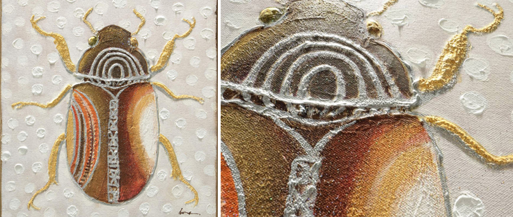 Skarabeus s výrazným etnickým vzorem v zemitých barvách vnese do vašeho interiéru nádech exotiky. Díky akrylovým barvám v kombinaci s dalšími materiály má obraz zajímavou strukturu s plastickým efektem. Akrylové barvy jsou známé svou stálobarevností, obraz vám tedy bude v nezměněné podobě krášlit interiér dlouhá léta.