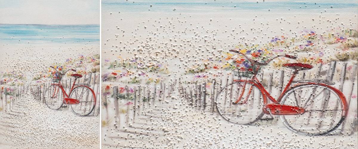 Stylový obraz W931 60x90 cm vás zahrne idylkou letního odpoledne. Každý den vás může takto těšit na stěně klasického nebo moderního interiéru. Obrazy Bubola e Naibo jsou ručně malovány umělci z celého světa. Vertikálně orientované plátno tvaru obdélníku zobrazuje jízdní kolo a lán pestrobarevných květin na písečné pláži s mořskou hladinou v pozadí. Vyveden je v elegantně decentních a tlumených vodových tónech, které se vám budou v rámci prostoru nádherně ladit. Pozoruhodná jsou také jemně zrnitá struktura povrchu, díky které obraz získává na autenticitě. Pusťte si domů nebo do kanceláře umění, které inspiruje a povznáší duši. Plátno lze objednat bez rámu nebo s rámem dle vašeho výběru z katalogu.