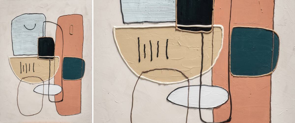 Stylový obraz W948 90x120 cm se nese v duchu současných trendů abstrakce a jednoduchých symbolů. Díky tomu mu to bude slušet zejména na stěně moderního interiéru. Obrazy Bubola e Naibo jsou ručně malovány umělci z celého světa. Vertikální plátno tvaru obdélníku zobrazuje simplistické útvary, snad budovy, nábytek, příslušenství nebo něco zcela jiného? Interpretace je jen na vás! Výjev je laděn v jemně neutrálních bleděmodrých, zlatavých, okrových a béžových tónech. Tyto barvy snadno sladíte s libovolnými doplňky a nábytkem. Pozoruhodná je také plastická struktura obrysů a hrubost celého povrchu, která obrazu dodává na autenticitě. Pusťte si domů nebo do kanceláře umění, které inspiruje a povznáší duši. Plátno lze objednat bez rámu nebo s rámem dle vašeho výběru z katalogu.