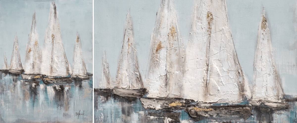 Stylový obraz W950 90x120 cm nadchne všechny příznivce vodního sportu. Každý den vás bude moct těšit na stěně klasického nebo moderního interiéru. Obrazy Bubola e Naibo jsou ručně malovány umělci z celého světa. Vertikální plátno tvaru obdélníku zobrazuje několik plachetnic na mořské hladině - možná zakotvených a možná čekajících na start závodu! Vyvedeno je v tlumených vodových tónech šedé, modré a krémové, které se vám budou v rámci prostoru nádherně ladit. Pozoruhodná jsou také jemně zhrublá struktura povrchu, díky které obraz získává na autenticitě. Pusťte si domů nebo do kanceláře umění, které inspiruje a povznáší duši. Plátno lze objednat bez rámu nebo s rámem dle vašeho výběru z katalogu.