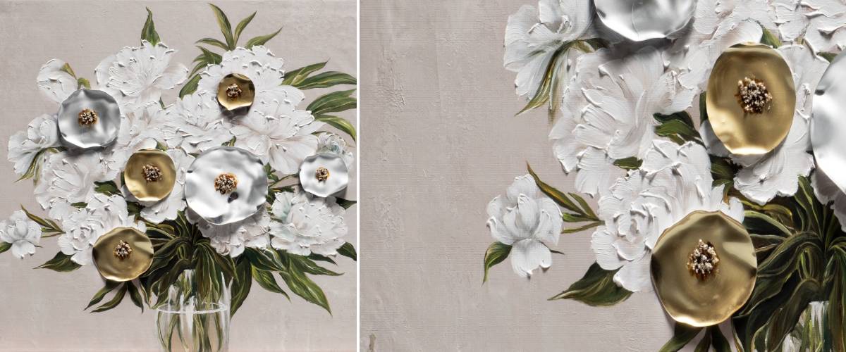Stylový obraz Z712 60x90 cm je nápaditým a moderním ztvárněním klasického zátiší s vázou. Kromě toho vás bude každý den těšit na stěně zejména moderního interiéru. Obrazy Bubola e Naibo jsou ručně malovány umělci z celého světa. Plátno tvaru obdélníku zobrazuje bohatý bílý pugét v nezvyklé barevnosti detailů. Elegantní a decentní béžové pozadí dává nádherně vyniknout stříbrným a zlatým plastickým květům. Pozoruhodné jsou také plastické obrysy okvětních lístků, díky kterým rostlinky téměř vystupují z obrazu směrem k vám. Pusťte si domů nebo do kanceláře umění, které inspiruje a povznáší duši. Plátno lze objednat bez rámu nebo s rámem dle vašeho výběru z katalogu.