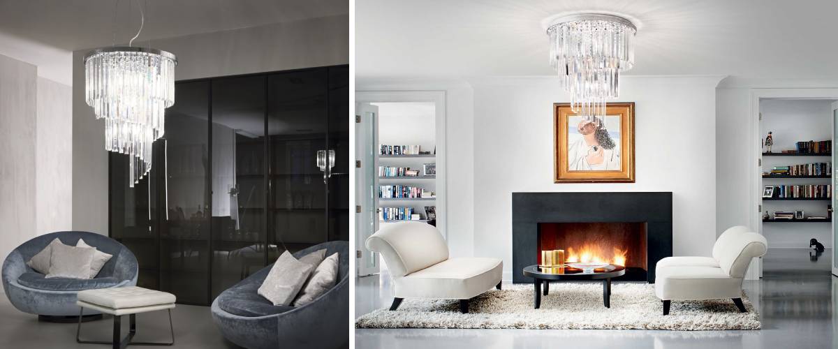 TheCARLTON Designer Small Pendant Lamp was created for all of you who desire a truly exclusive and luxurious light fixture. This extraordinary light, which combines classic elegance in a modern design, has a metal frame in chrome. A cluster of chains carrying sparkling crystals in various shapes and sizes is lowered from the frame and arranged in a spectacular cascading spiral. Light penetrating from the inside out through the crystals then plays out a plethora of effects for a unique atmosphere. The CARLTON designer pendant lamp is recommended for homes, offices as well as public and commercial spaces where an impression is needed. You will also find a larger version of this model in our catalogue.
