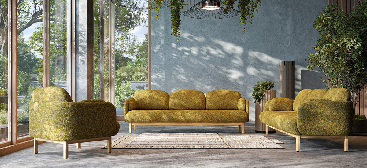 At home in the office. This motto can be fulfilled with the comfortable MYAMI sofa. In addition to offices, its flowing lines fit in reception areas, lounge areas, hotel lobbies and home offices, where they create a welcoming and inspiring environment. The construction made of pine, plywood and chipboard ensures robustness and stability, while superior comfort is provided by HR foam of various densities. Upholstery is available in a range of colours and materials including the highly desirable bouclé fabric. The frame with base is made of ash wood in light or dark stains. The MYAMI collection offers sofas and armchairs with different types of base. Explore it and choose seating to suit your stylish space!