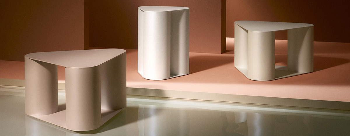 The TRES low coffee table was created by the creative duo Mut Design from Valencia. The form of the table is based on a triangular surface with rounded edges, which is elegantly carried by three cylinders referring to a spontaneous meeting of three friends. The result is a distinctive sculptural object that is both stable and light. The table is available in two sizes and is made of lacquered metal - you can choose pearl shades inspired by seashells or white or grey classics.