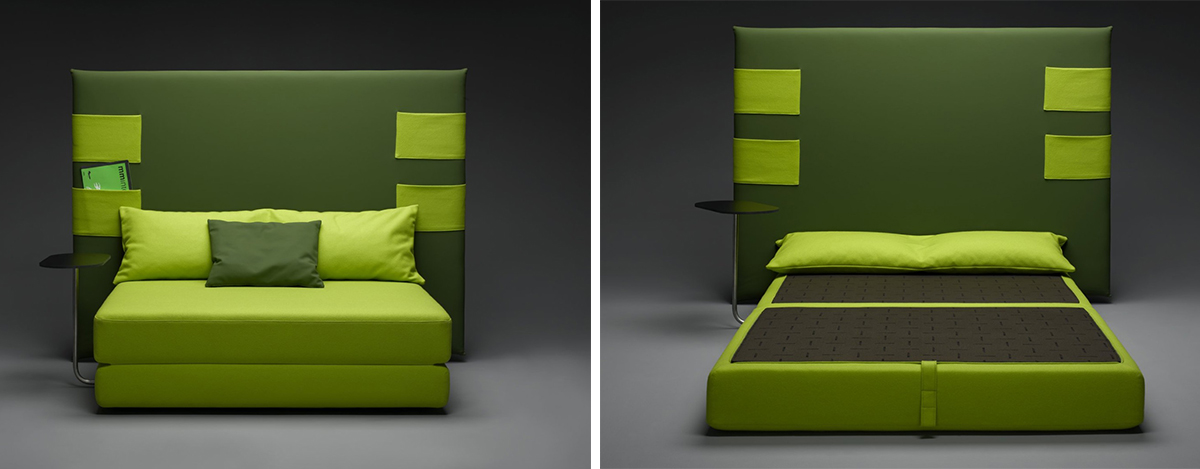 Přes den komfortní posezení, v noci pohodlné lůžko. Rozkládací sedačka MY SKIN od návrháře Jiřího Pelcla se hodí zejména do mladistvých bytů. Dřevěná kostra polstrovaná tou nejkvalitnější polyuretanovou pěnou je čalouněná látkou z široké palety barev. Potah je snímatelný, lze ho tedy snadno vyčistit. Opěrák plní funkci čela postele a kromě toho obsahuje držáky na knihy, časopisy nebo jiné drobnosti. Vybrat si můžete verzi s kovovým otočným stolkem nebo bez něj. Jednoduché tvary sedačky zapadnou do jakéhokoli stylu bydlení, stačí zvolit ten správný odstín.