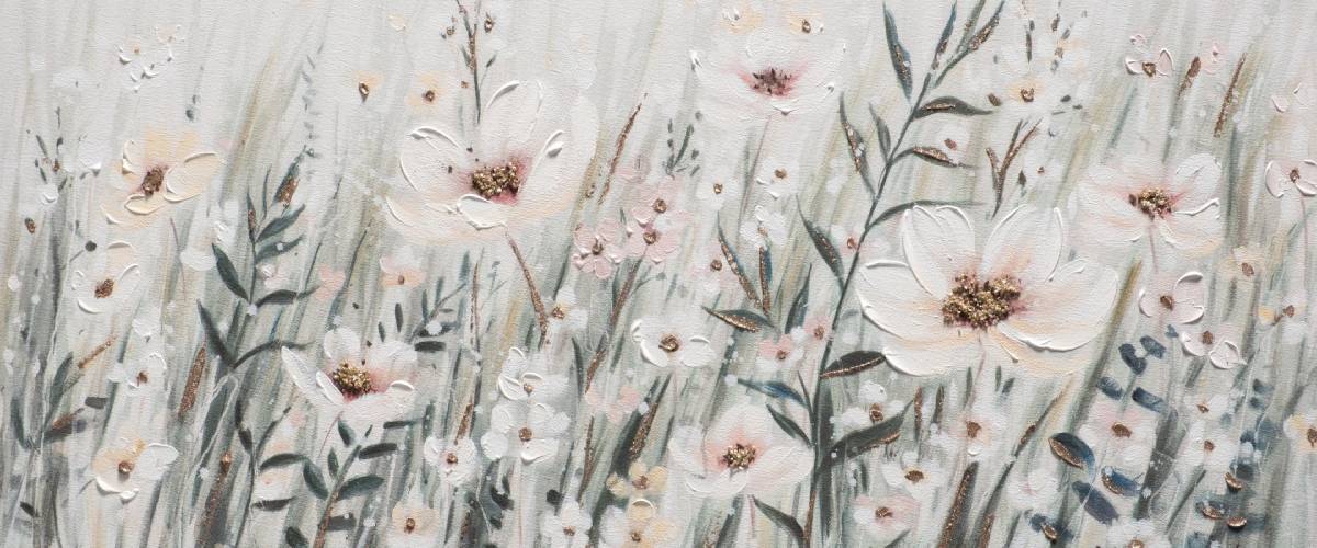 Štýlový obraz W934 60x120 cm je ako dotyk rannej rosy na prebúdzajúcej sa lúke. Bude vás tešiť každý deň na stene moderného aj klasického interiéru. Obrazy Bubola e Naibo ručne maľujú umelci z celého sveta. Na horizontálnom plátne v tvare obdĺžnika sú znázornené rozkvitnuté lúčne kvety a zelené steblá zahalené do hmlistého oparu. Je vyvedený v elegantných tlmených tónoch s iskrivými zlatými akcentmi na jemnom sivom pozadí. Túto farebnú schému možno v priestore veľmi efektívne kombinovať. Pozoruhodné sú aj početné sochárske detaily, ktoré zvyšujú autentickosť obrazu. Vpustite do svojho domova alebo kancelárie umenie, ktoré inšpiruje a povznáša dušu. Plátno si môžete objednať bez rámu alebo s rámom podľa vlastného výberu z katalógu.
