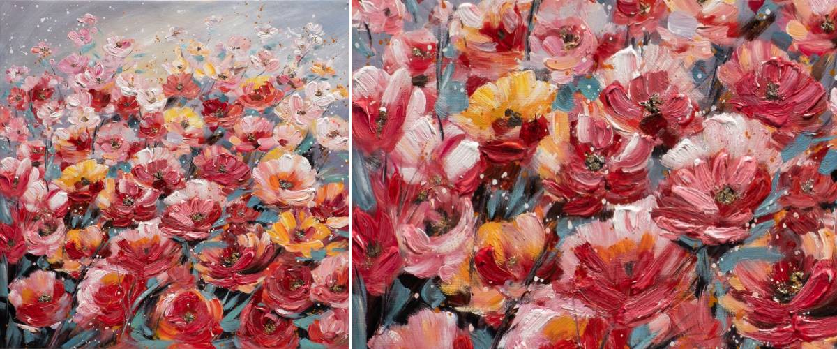 Štýlový obraz Z709 60x60 cm vás prenesie do voňavého letného raja. Okrem toho vás bude každý deň tešiť na stene moderného aj klasického interiéru. Obrazy Bubola e Naibo ručne maľujú umelci z celého sveta. Plátno v tvare štvorca zobrazuje lúku plnú rozkvitnutých kvetov. Je vyvedený v odvážnych romantických tónoch na elegantnom tmavosivom pozadí. Tieto farby v priestore krásne vyniknú. Pozoruhodné sú aj početné reliéfne detaily, ktoré zvyšujú autentickosť obrazu. Vpustite do svojho domova alebo kancelárie umenie, ktoré inšpiruje a povznáša dušu. Plátno si môžete objednať bez rámu alebo s rámom podľa vlastného výberu z katalógu.