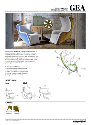 Designové křeslo GEA s nízkým opěrákem našlo inspiraci v 18. století. Křesla z této doby měla rozšířený opěrák jako ochranu proti průvanu a před žárem praskajícího ohně v krbu. Talentovaný designér Giovanni Tommaso Garattoni vzal tento design a vtiskl mu moderní podobu, která se vyznačuje zejména designovou bukovou podnoží a možností hravě kombinovat barvy. Na dotaz je možné objednat si i podnož lakovanou v odstínu dle výběru. Křeslo má překližkový rám vyplněný nedeformovatelnou polyurethanovou pěnou.
