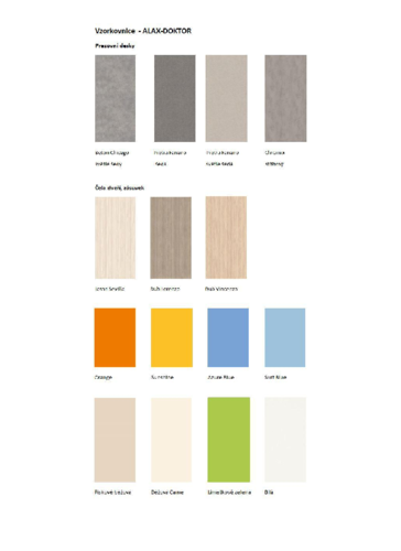 Korpus skříňky je vždy bílý, pracovní deska je dostupná ve čtyřech odstínech šedé barvy, úchytky jsou z nerezi. Všechny položky lze na dotaz vyrobit i v jiném provedení za příplatek.