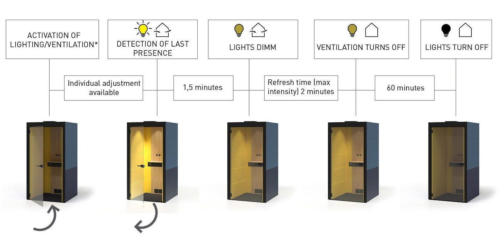 Díky řešení větrání a osvětlení nabízí SILENT ROOM prostředí zvyšující produktivitu. Čtyři vysoce výkonné ventilátory zajišťují správný průtok vzduchu (174 m³ / h) a jejich nízký provozní hluk je stejně tichý jako zvuk šustění listů. Kombinace tří LED lamp vytváří příjemnou a domáckou atmosféru. Inteligentní řídící jednotka volí optimální úroveň ventilace a osvětlení a v případě potřeby umožňuje individuální nastavení. Jakmile zaměstnanec opustí SILENT ROOM, automaticky se aktivuje intenzivní větrání a připraví místnost pro dalšího uživatele. Tento akustický kus nábytku také pomáhá s úsporou energie, protože automaticky tlumí světla, když v místnosti nikdo není, a po nějaké době je dokonce vypne.