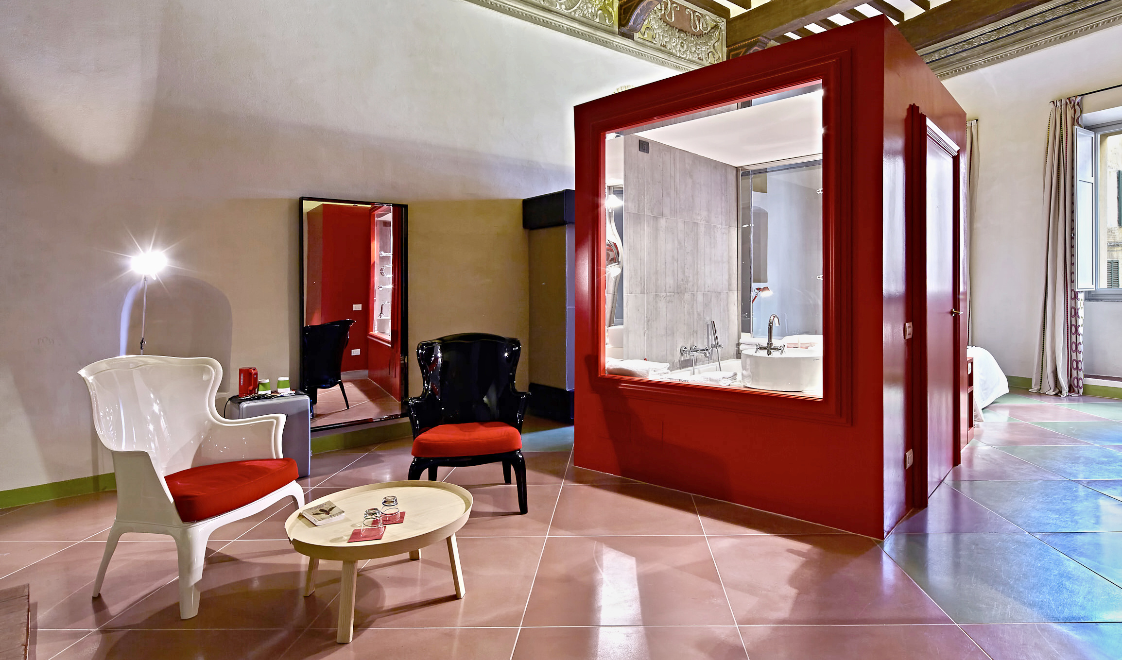 Kromě stylových kaváren a restaurací se Siena pyšní i moderními designovými hotely. Nás zaujal malý butikový hotel The Palazzetto Rosso s devíti pokoji, které vás dostanou svým neotřelým vzhledem. Pokoj Suite Design Red je vybaven luxusními křesly Pasha od Pedrali a v pokoji Cosy Deluxe můžete relaxovat na židli Ester a odložit si šálek čaje a vaši oblíbenou knihu na stolek Twine od Casamanie. I společné prostory jsou vybaveny kousky od našich partnerů. Kromě dalších skvostů tu naleznete třeba i židle Tweet, stylové sedačky Zippo nebo barové stoličky Kant.