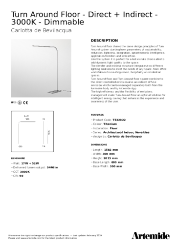 Do kanceláře, zasedací místnosti, restaurace i soukromého obydlí. Stojací lampa TURN AROUND vnese kvalitní design, variabilitu použití i udržitelnost do jakéhokoli prostoru. Designérka Carlotta de Bevilacqua ji navrhla s ohledem na různé potřeby. Štíhlá a lehká konstrukce z kovu obsahuje dva programy svícení (přímé a nepřímé), které lze ovládat jak manuálně, tak z aplikace Artemide. Díky tomu je také ideálním řešením pro úsporu energie. K dispozici jsou také dvě různé teploty světla.
