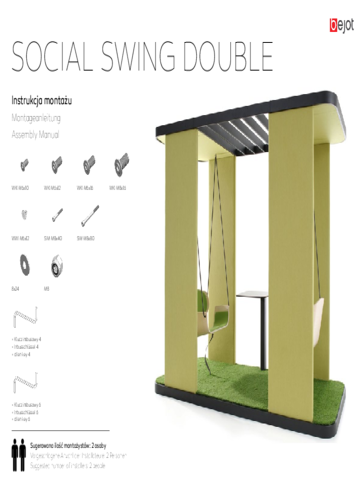 SOCIAL SWING pomůže srovnat si myšlenky, uvolnit se a uklidnit. Tato houpačka je ideálním produktem pro regeneraci mysli během krátké přestávky. Lakovanou kovovou konstrukci lze vybrat z několika odstínů. Konstrukce houpačky je zhotovena ze dubové dýhy s čalouněným sedákem a opěrákem. Ty si vybíráte z pestrého katalogu možností textilií a barev. Závěsy houpačky jsou vyrobeny z lakovaného kovu v barvě konstrukce. Bezpečnostní nylonový pás brání vychýlení zavěšeného křesla. Samostatně volíte také provedení čalounění postranních panelů, za příplatek lze čalounit i strop konstrukce. Podlaha je dřevěná a potažená umělou trávou, přičemž rám je lakovaný v barvě konstrukce. Mezi dvěma houpačkami se nachází praktický stoleček s deskou z masivního dubu, HPL nebo melaminu.