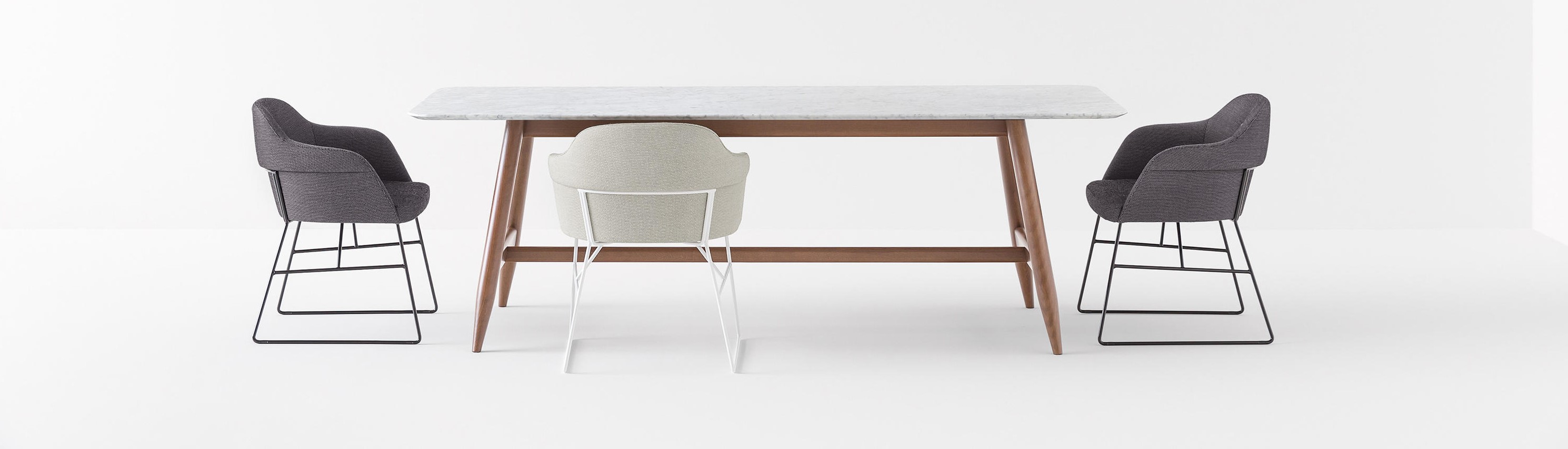 V kolekci najdete dřevěné a ocelové provedení pdonože. Rám z mořeného nebo lakovaného bukového dřeva a čalounění z látky, umělé nebo pravé kůže. Lakovaný ocelový rám a čalounění v látce, umělé nebo pravé kůži. Stoly s rámem z mořeného nebo lakovaného bukového dřeva a horní částí z lakovaného mdf nebo bílého nebo černého mramoru.