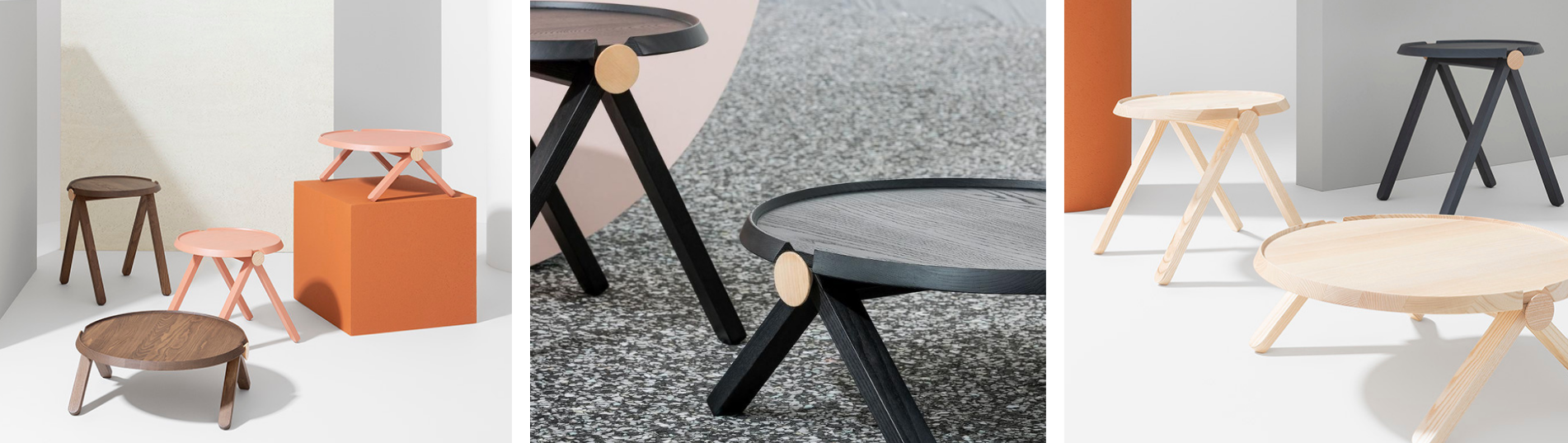 Velmi nízké konferenční stolky z mořeného nebo lakovaného masivního dřeva pro italského výrobce Billiani navrhlo studio Studioventotto. Charakteristickým prvkem jsou také dva kontrastní knoflíky z přírodního dřeva, které mrkají jako zářivé malé oči. Knoflíky usnadňují montáž a demontáž. Díky tomu stoly můžeme dodávat v plochém balení pro snadnou a ekologickou přepravu.