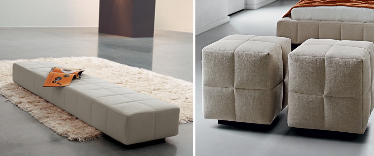 Designový pouf ve tvaru krychle k posteli SQUARING pro posezení v ložnici u postele SQUARING. To vše v luxusním a komfortním celočalouněném provedení s elegantním prošíváním! Pouf má prakticky neviditelnou nízkou podnož ze dřeva, konstrukce je čalouněna ve vybrané variantě a barvě textilie, kůže nebo eko-kůže. Model doporučujeme spíše do moderních interiérů. O návrh se postaral průmyslový designér Giuseppe Viganò.