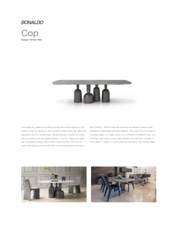 Luxusní kruhový stůl COP je zcela ojedinělým kouskem pro všechny s vytříbeným vkusem. Značka BONALDO zde dává na odiv prvotřídní kvalitu a materiály. Tento výjimečný stůl COP stojí na výrazné robustní kovové podnoži tvarované jako tři převrácené kalichy, kterou si můžete dle dispozic interiéru vybrat v tlumených odstínech matných barevných laků. Pomyslnou třešničkou na dortu je pak kruhová stolová deska, kterou si můžete zvolit mramorovou, dřevěnou nebo keramickou v různých odstínech s ušlechtilou kresbou povrchu. Svrchní desku nabízíme ve 3 velikostech pro opravdu každý prostor. Kruhový stůl COP doporučujeme využít v komerčních a veřejných interiérech či kancelářích, kde se okamžitě stane stylovou dominantou.