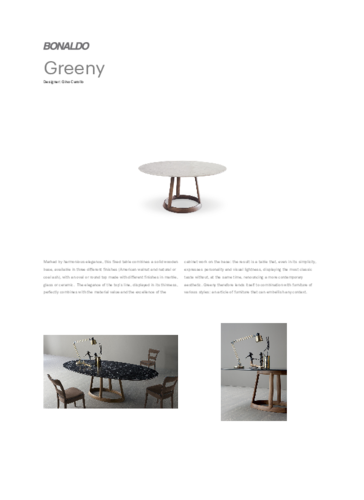 Oválný stůl GREENY v různých velikostech je zcela ojedinělým kouskem pro všechny s vytříbeným vkusem. Značka BONALDO zde dává na odiv prvotřídní kvalitu a materiály. Dominantou oválného stolu GREENY je výrazná dřevěná podnož. Vybrat si ji můžete ve světlém ořechu či tmavém jasanu. Kruhová stolová deska dostupná ve 2 velikostech je na výběr z mramoru či skla opět v různých variantách provedení a s krásnou přírodní kresbou. Tento designový kousek najde své místo ve vaší kuchyni, jídelně, ale i ve stylových komerčních prostorech. V našem katalogu najdete také kruhovou variantu stolu GREENY.