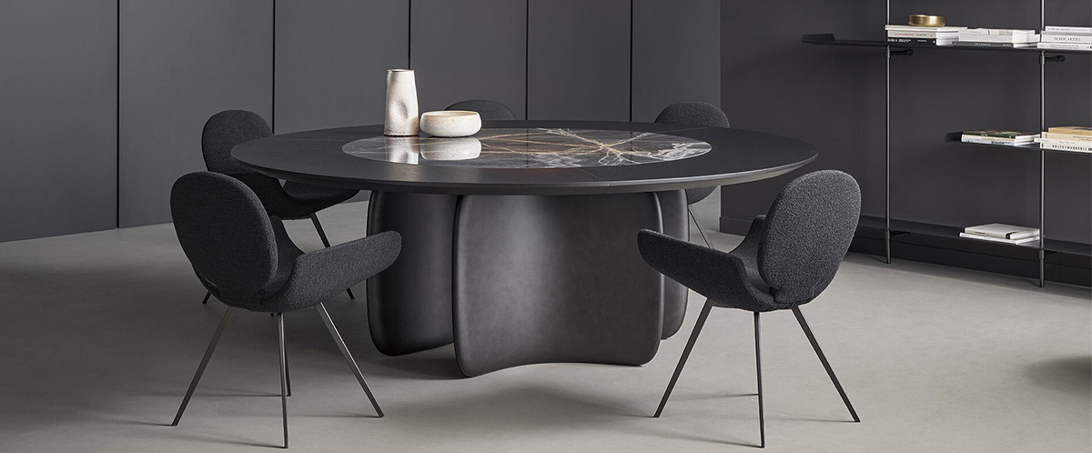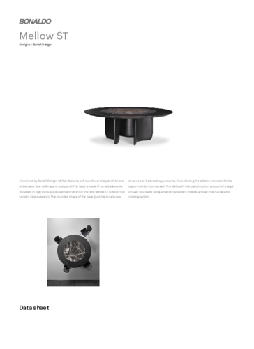 Kruhový stůl MELLOW od studia Bartoli Design v různých velikostech je zcela ojedinělým kouskem pro všechny s vytříbeným vkusem. Značka BONALDO zde dává na odiv prvotřídní kvalitu a materiály. Dominantou stolu MELLOW je výrazná podnož z polyuretanu představující neúplný válec. Kruhová stolová deska dostupná ve třech velikostech je tvořena dřevěným rámem a otočnou vložkou z keramiky v několika dekorech. Tento designový kousek najde své místo ve vaší kuchyni, jídelně, ale i ve stylových komerčních prostorech. V našem katalogu najdete také kruhovou a obdélníkovou variantu bez otočné desky.