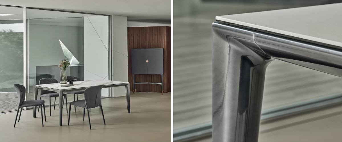 Designový stůl DUKE splní vaše sny o dokonale moderním, robustním a unikátním kousku, který ve vaší domácnosti vydrží po celé generace a neustále bude poutat pozornost svým neotřelým vzhledem. Obdélníkový stůl, který u nás najdete hned v několika velikostech, má bytelnou kovovou konstrukci na čtyřech nohách. Tu si můžete vybrat v lakovaných nebo dokonce speciálních variantách, přičemž v každé kategorii se nabízí různé barevné odstíny. Cekový styl pak doladíte výběrem desky s mírně zaoblenými rohy ze skla, mramoru nebo keramiky. Můžete tek kombinovat střídmější variace nebo naopak zvolit desku s výraznou povrchovou kresbou. DUKE byl stvořen, aby doslova vévodil současnému interiéru!