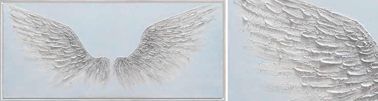 Sugestivní obraz W721 - 65 x 150 s malbou andělských křídel v jemných barvách vnese do vašeho domova klid a eleganci. Díky svému pojetí vynikne zejména v moderně laděných interiérech. Dílo je malováno ručně na plátno profesionálními umělci, proto je každý kus originál a uspokojí tak i náročné klienty. Díky akrylovým barvám v kombinaci s dalšími materiály má obraz zajímavou strukturu s plastickým efektem. Akrylové barvy jsou známé svou stálobarevností, obraz vám tedy bude v nezměněné podobě krášlit interiér dlouhá léta. Obraz je možné objednat s různými typy rámů, které doladí váš interiér. K obrazu je přiložen certifikát potvrzující, že tento obraz je skutečný originál.