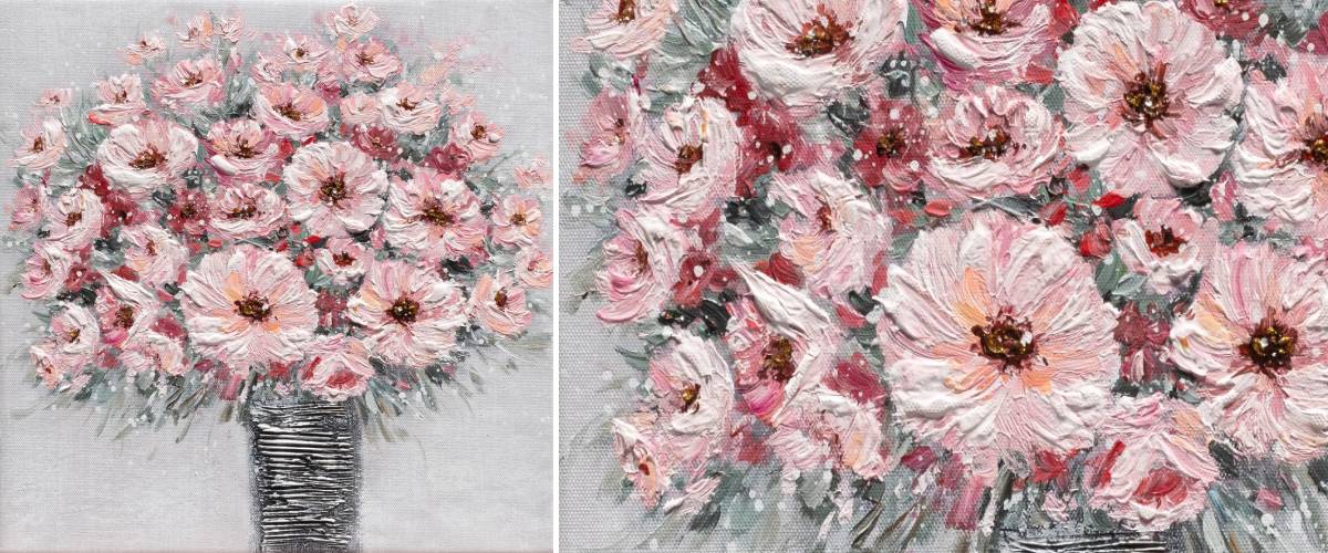 Stylový obraz Z700 30x30 cm je dalším skvostným kouskem, který vás bude každý den těšit na stěně moderního i klasického interiéru. Obrazy Bubola e Naibo jsou ručně malovány umělci z celého světa. Plátno tvaru čtverce zobrazuje romantické zátiší s vázou plnou rozkvetlých květin. Vyveden je v optimistických pastelových tónech na decentním šedém pozadí, které velmi snadno sladíte s libovolnými doplňky a nábytkem. Pozoruhodné jsou také plastické detaily rostlin a vázy, které obrazu dodávají na autenticitě. Pusťte si domů nebo do kanceláře umění, které inspiruje a povznáší duši. Plátno lze objednat bez rámu nebo s rámem dle vašeho výběru z katalogu.
