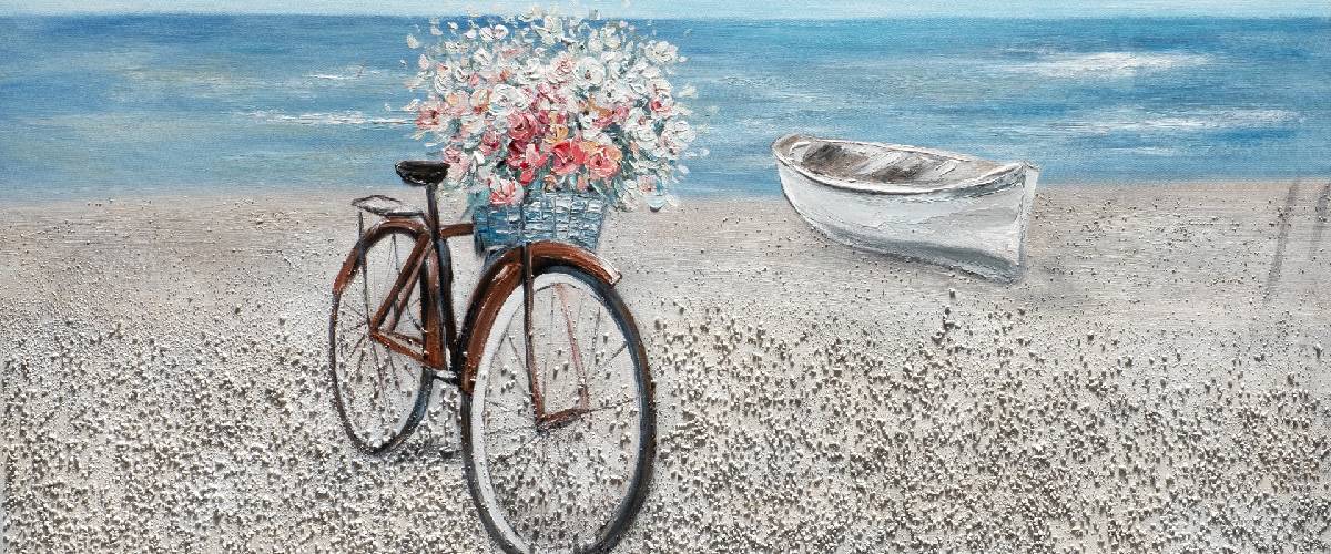 Stylový obraz Z713 65x150 cm vás zahrne idylkou letního odpoledne. Každý den vás může takto těšit na stěně klasického nebo moderního interiéru. Obrazy Bubola e Naibo jsou ručně malovány umělci z celého světa. Horizontálně orientované plátno tvaru obdélníku zobrazuje jízdní kolo s košíkem květin a dřevěnou loďku na písečné pláži na břehu moře. Vyveden je v elegantně decentních a tlumených vodových tónech, které se vám budou v rámci prostoru nádherně ladit. Pozoruhodná jsou také jemně zrnitá struktura povrchu, díky které obraz získává na autenticitě. Pusťte si domů nebo do kanceláře umění, které inspiruje a povznáší duši. Plátno lze objednat bez rámu nebo s rámem dle vašeho výběru z katalogu.