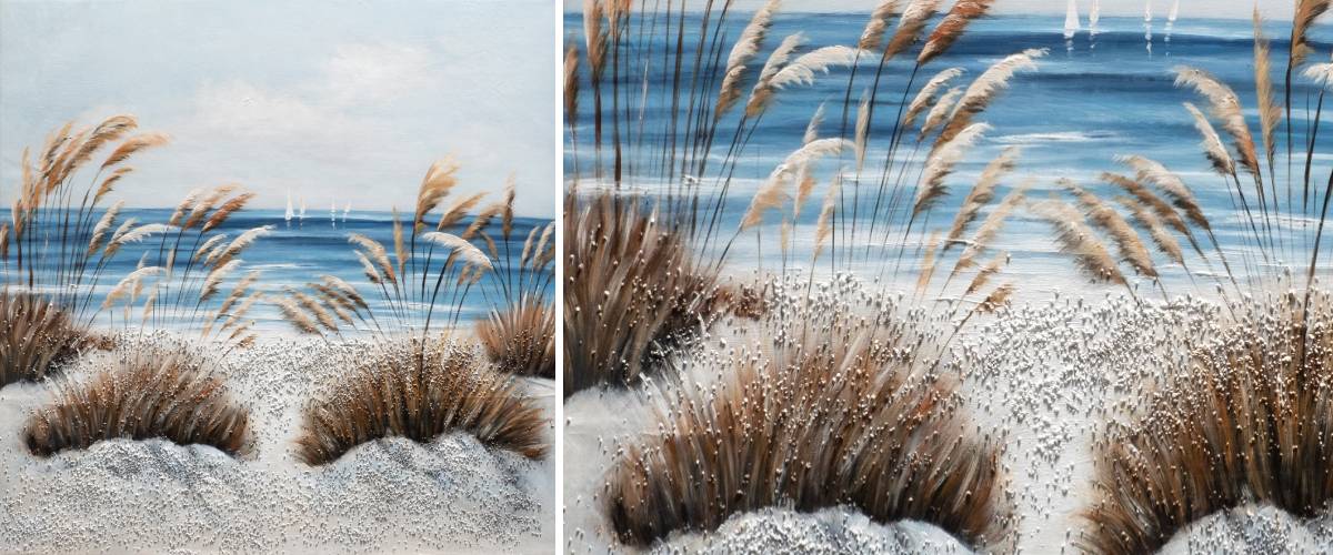 Stylový obraz Z722 100x100 cm vám zprostředkuje zaslouženou chvilku relaxace kdykoli na něho pohlédnete. Vyjímat se bude na stěně klasického i moderního interiéru. Obrazy Bubola e Naibo jsou ručně malovány umělci z celého světa. Plátno tvaru čtverce zobrazuje písečnou pláž porostlou zlatavými klásky a v pozadí plachetnice na mořské hladině. Vyveden je intenzivních tónech modravé v kombinaci se zemitými odstíny. Tyto barvy se velmi dobře kombinují s ostatními doplňky a nábytkem Pozoruhodná jsou také zrnitá struktura znázorňující písek, díky které obraz získává na autenticitě. Pusťte si domů nebo do kanceláře umění, které inspiruje a povznáší duši. Plátno lze objednat bez rámu nebo s rámem dle vašeho výběru z katalogu.
