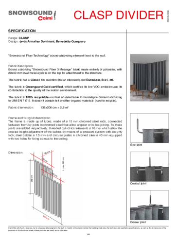 Italská značka Caimi Brevetti neustále pokračuje ve výzkumu v oblasti akustického designu. Jejich důsledný přístup vedl k vývoji technologií, jako je právě Snowsound®-Fiber, na které jsou založeny panely pohlcující zvuk CLASP. Skládají se z měkkých polyesterových vláken. Interakce mezi speciálními akustickými vlákny a uspořádáním objektů umožňuje snížit nepříjemný zvukový dozvuk v prostředí.