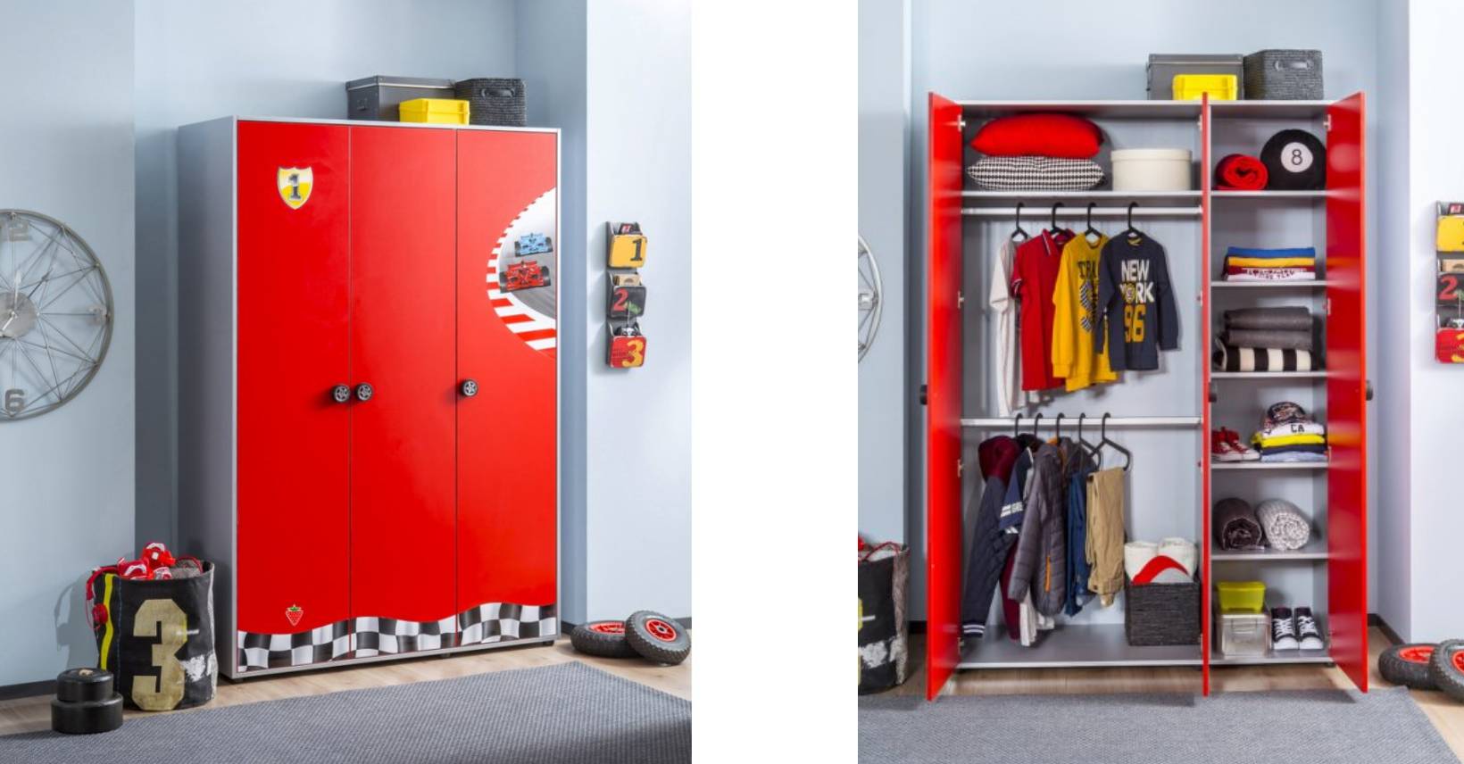 Skříň je dostatečně prostorná, uvnitř nabízí hned dvě šatní tyče (bez osvětlení). Úchytky dvířek jsou vyvedeny ve tvaru automobilových kol. Produkt je vyroben z odolné MDF v červené a šedé barvě celé kolekce.