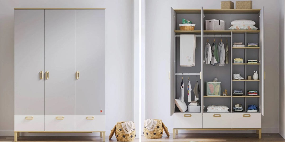 Do prostorné skříně MINO BABY se vejde celý dětský šatník. Do tří spodních zásuvek můžete umístit drobnější kousky oblečení. Za dveřmi skříně se nachází šatní tyče a několik polic, které pojmou vše ostatní. Dveře jsou také vybaveny panty s brzdou a zásuvky pojezdy s pomalým dovíráním. Korpus i dveře jsou z MDF desky, přičemž záda disponují větracími kapslemi. Tak vsaďte na multifunkčnost a styl!