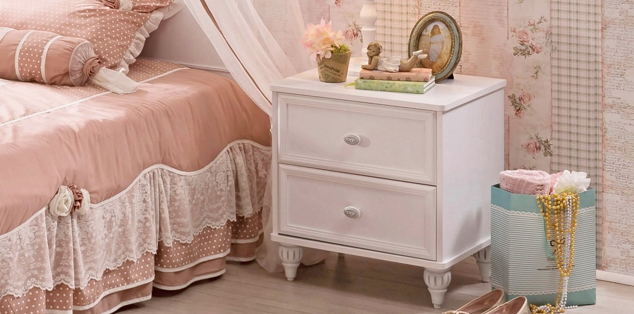 Noční stolky většinou není první kousek nábytku, který pořizujeme, když vybavujete pokojíček vaší malé princezně. Přesto ale najdou své uplatnění, a to především jako úložný prostor poblíž postele nebo kousek, na který můžete položit lampičku, rozečtené pohádky nebo hrneček s kakaem. Malý, ale přesto praktický noční stolek ROMANTICA se pyšní dvěma zásuvkami, stylovým reliéfním zdobením a vyřezávanými nohami z masivu.