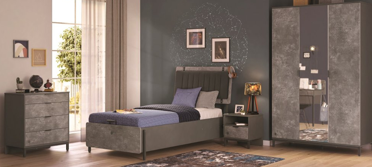 Vzor šedého kamene, tmavé barvy a minimalistické tvary potěší vaše dospívající ratolesti. Díky své univerzálnosti bude kolekce nábytku SPACE GREY skvělým společníkem až do dospělosti. Najdete v ní několik velikostí postelí, praktické úložné skříně, komody i noční stolek. Nechybí ani psací stůl. K jednotnému stylu tohoto moderního nábytku snadno sladíte další doplňky. Pak lze celkový ráz pokoje obměnit pomocí detailů, aniž byste museli kupovat nový nábytek.