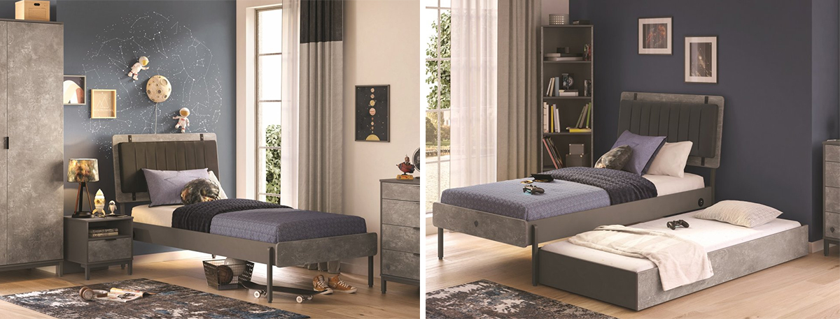 Pro kluky i holky! V posteli SPACE GREY se budou zdát ty nejkrásnější sny. Teenageři zajisté ocení USB vstup, který lze umístit na pravou či levou stranu dle libosti. Rám je vyroben z MDF desky v šedé barvě a dekoru betonu, čelo postele je čalouněné eko kůží. Cena postele je bez matrace, vhodný rozměr je 120 x 200 cm. Deskový rošt na zpevněném kovovém rámu je součástí. Nosnost postele je 130 kg a lze ji doplnit výsuvným lůžkem. Nadčasový design se zavděčí milovníkům jednoduchosti, při správné volbě doplňků však zvládne i extravagantnější vzhled.