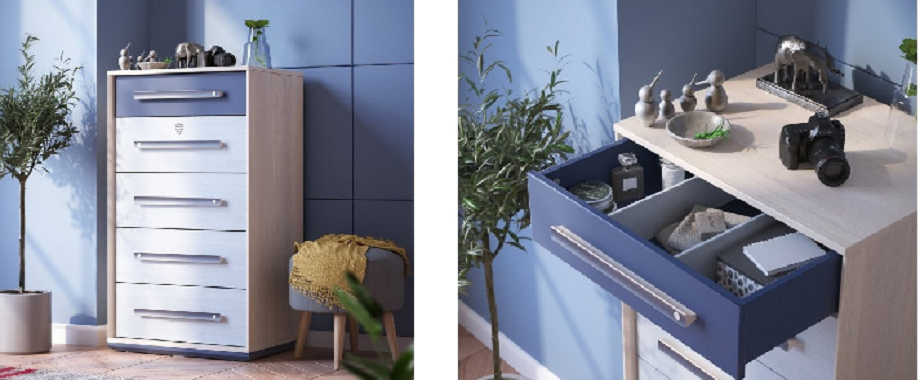 V dětském i studentském pokoji je více než kde jinde třeba úložný prostor. Proto jsou funkčním a praktickým řešením komody, jelikož nezaberou mnoho místa, a zároveň poskytují dostatek úložného prostoru. Komoda TRIO se pyšní pěti prostornými zásuvkami, pevnou konstrukcí a kvalitními pojezdy. Hravě do ní tak schováte všechno oblečení, školní potřeby i jiné nezbytnosti, které vaše ratolest potřebujeme mít ve svém pokoji.