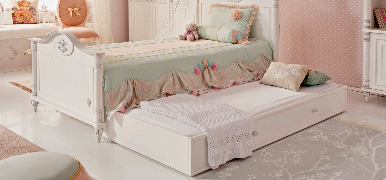 Vysouvací přistýlka ROMANTIC s deskovým perforovaným roštem pro dobrou větratelnost je všeobecně skvělý pomocník do dětského pokoje. Můžete ji využít jako úložný prostor, který lze díky kolečkům lehce zasunout pod postele ROMANTIC. Úložný prostor využijete například na hračky, časopisy, sportovní potřeby a další nezbytnosti. Pokud se rozhodnete zakoupit i matraci, máte k dispozici lůžko pro příležitostné přespání kamarádů či příbuzných. Záleží jen na vás, která funkce výsuvu je pro Vás zajímavější.