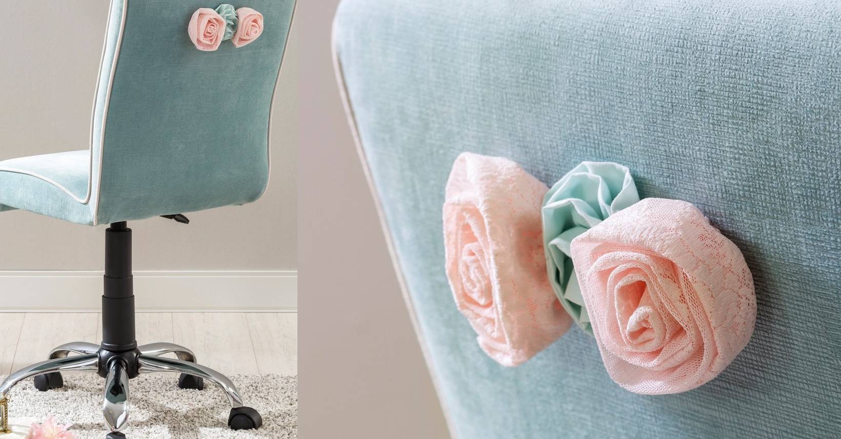 Korpus sedáku a opěráku se vyrábí z jednoho kusu překližky, který je čalouněný v tyrkysovém odstínu. Opěrák je ozdoben dvěma knoflíky, ze zadní strany se nachází zajímavá květinová dekorace. Židle sedí na centrální podnoži s výškově stavitelným a otočným mechanismem.