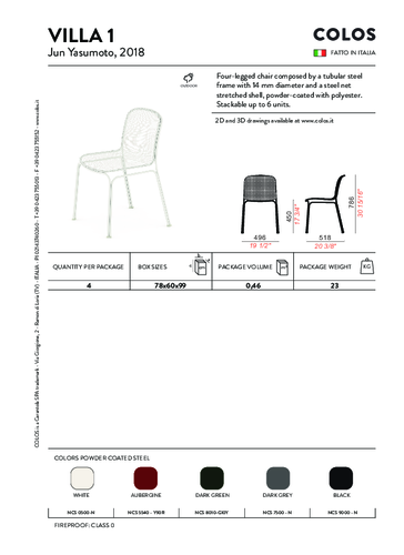 Židle VILLA pro italského výrobce Colos navrhl Jun Yasumoto, který se inspiroval venkovním posezením typickým pro pařížské terasy. VILLA interpretuje způsob montáže konstrukčních prvků s cílem skládat jednotlivé díly tak, aby bylo dosaženo účinné konstrukční pevnosti. Díky jemné hře křivek a spojů je sedák mírně zvednutý do stran od nohou, což modelům dodává na vzdušnosti a originalitě.