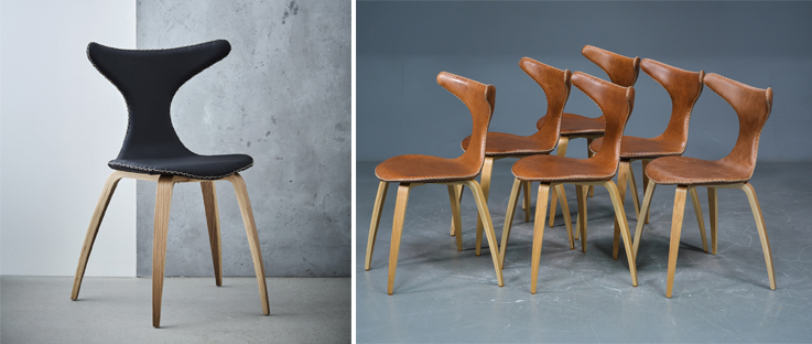 Nadčasový a nezaměnitelný design židle Dolphin nezapře severskou tradici bydlení. Konstrukce sedadla je z ohýbaného dřeva a vysoce elastické výplně, která přispívá ke komfortu sezení. Výrazným prvkem židle je prvotřídní kožené čalounění s ručně šitým křížovým stehem kolem okrajů. Tento model je dodáván s dřevěnými nohami. Konstrukce podnože je tvořena dubovou dýhou (ohýbané dubové lamely), sedák je čalouněn kůží a rozměry židle jsou Š 55 x H 50 x V 83 cm. Židle je dodávána v setu 4ks.