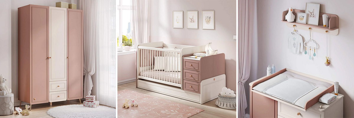 Něžná a zároveň moderní. Taková je kolekce ELEGANCE BABY, která vyniká kombinací krémově bílé a pastelově růžové barvy. Akcenty v podobě bronzově lesklých kovových nožek a úchytek jí dodávají luxusní vzhled, zatímco zkosené nožky a celková silueta vychází ze skandinávského stylu. V kolekci najdete rostoucí postýlky pro miminka, komody, přebalovací pulty, skříň i praktické poličky. Stejně jako ostatní produkty od rodinné značky ČILEK, bude i tato řada nábytku ideálním společníkem v prvních okamžicích života vašeho potomka.