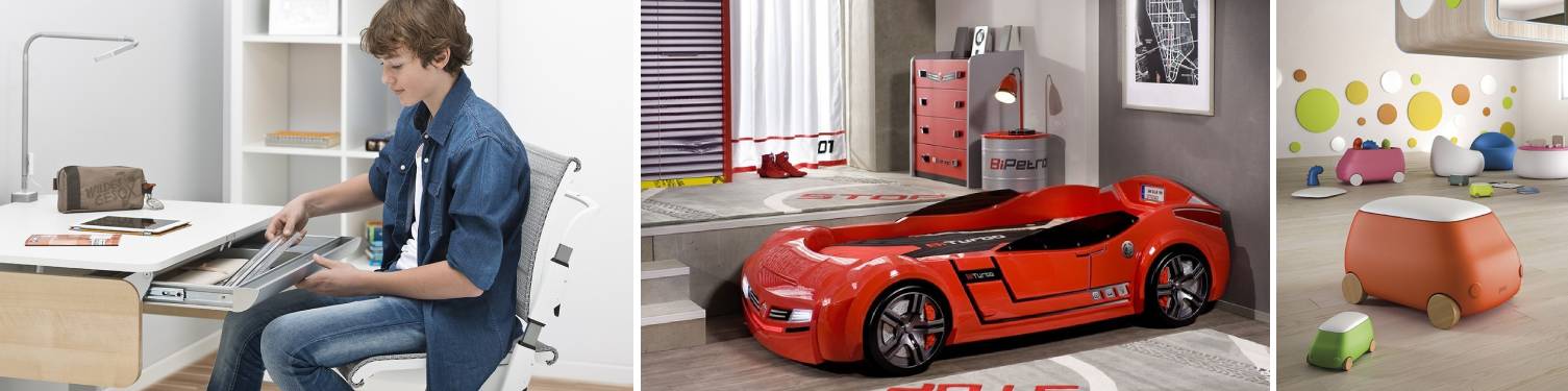 Nabízíme dětský nábytek pro holky i kluky - miminka, předškoláky, školáky i teenagery, který splňuje přísné nároky na kvalitu, bezpečnost, a zároveň i design. Vyberte si z katalogu produktů od špičkových evropských výrobců, jako jsou PEDRALI, SLIDE, MAYER nebo MOLL. Nabízíme postýlky pro miminka (klasické i rostoucí) i postele pro větší děti, včetně matrací, roštů a lůžkovin. Dále u nás najdete kvalitní dětský rostoucí nábytek - židle a psací stoly, které můžete nastavit podle toho, jak dítě roste, a zajistit mu tak zdravý vývoj. Zároveň ušetří i vaši peněženku, protože vydrží celé dětství a vy nebudete muset kupovat nové a nové kousky. Nechybí zde ani klasické psací stoly a židle, úložné prostory v podobě kontejnerů, komod, nočních stolků nebo šatních skříní. Pokud sháníte nábytek, který se k sobě hodí, můžete se inspirovat kolekcemi designového dětského nábytku od firmy ČILEK v různých stylech do dívčího i klučičího pokoje. Ať už máte doma malou princeznu nebo milovníka pirátů či závodních aut, v rozsáhlých kolekcí si zajisté vyberete. S vybavením dětského pokoje vám rádi pomůžeme v našem showroomu v Praze!