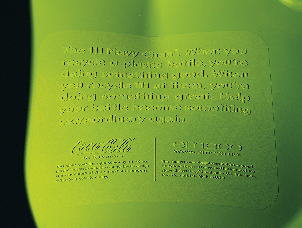 Začalo to šrotem z hliníku. Tenkrát to ještě neznamenalo žádnou ,,zelenou cestu", recyklovaný hliník byl prostě tím správným materiálem pro tuto práci. Nyní se hliníkový šrot podobně jako koksové láhve, průmyslové zametače, použité dřevo nebo energeticky úsporný beton, zaujal daleko modernější postavení. Lidé čím dál více oceňují ekologické materiály. Revolučním kouskem byla 111 Navy, její tvorba vyžadovala novou vědu a hodně tvrdé práce, ale pokud by se projekt povedl, mohlo Emeco zachránit tuny šrotu ze skládek. 111 Navy je židlí, která jde daleko za hranice recyklace. Emeco inspirovalo mnoho designérů, aby přemýšleli o originálních projektech s využitím recyklovaných materiálů a u mnoha známých a vlivných designérů jako Philippe Starck, Konstatntin Grcice či Jasper Morrison se jim to povedlo.