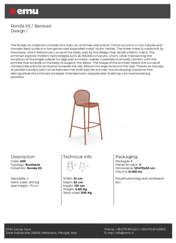 Barová židle RONDA X se vyznačuje moderním zvlněným tvarem. Zkrácené tělo židle sedící na ocelové konstrukci tvoří kovová síť, která umocňuje nadčasovou krásu tohoto výrobku. Kousek s přehledem obstojí ve zkoušce každodenního používání a zvládne i ne vždy dobré venkovní podmínky. Barová židle RONDA je velmi praktická díky tomu, že je stohovatelná až do výše čtyř kusů a lze ji využít ve venkovním i vnitřním prostředí. Je k dispozici v několika barevných variantách. V kolekci RONDA najdete také jídelní židle.