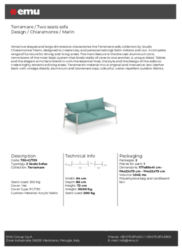 Sedačka TERRAMARE byla navržena pro vytvoření útulného prostředí. Sedačka má hliníkovou konstrukci, která vás okouzlí svou inovativní elegancí a minimalistickým designem, díky kterému se hodí do jakéhokoliv druhu prostor uvnitř i venku. Materiál sedačky je originální, opěrák je vyroben z ekokůže s vintage úpravou. Můžete vybírat celkem z pěti barevných provedení konstukce sedačky a z mnoha druhů čalounění. Sedačku TERRAMARE si tak přizpůsobíte všem vašich představám. Pro ještě větší pohodlí můžete přikoupit stylový polštář.