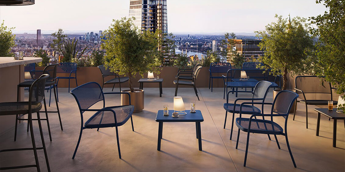 Sedačka CAFÉ od francouzského designéra Christopha Pilleta spojuje moderní jednoduchost s jemným odkazem na klasický kavárenský styl. Čisté linie, vyvážené proporce a promyšlený design z něj dělají univerzální kousek, který se snadno začlení do různých typů interiérů i exteriérů. Konstrukce z pevné oceli zajišťuje vysokou odolnost a dlouhou životnost i při každodenním používání. Díky široké paletě barev lze křeslo snadno sladit s okolním prostředím, ať už jde o soukromou terasu, zahradu, nebo frekventované prostory kaváren a restaurací. Prozkoumejte celou kolekci CAFE a vytvořte si komfortní a stylové posezení. Minimalistický design navíc umožňuje snadné kombinování s nízkými stolky z dalších kolekcí EMU.