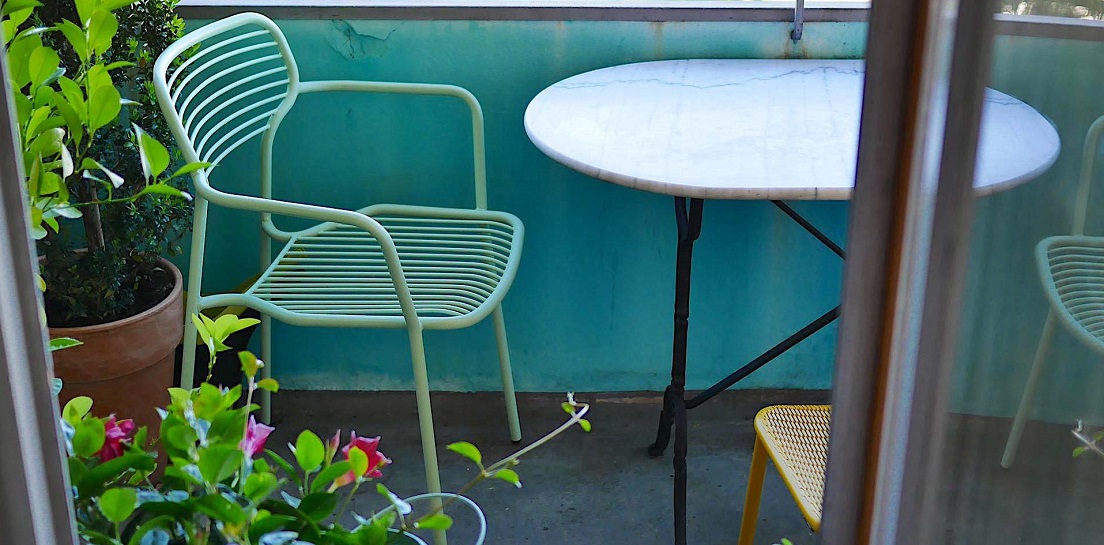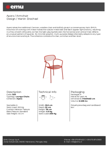 Židle APERO se zdá jednoduchá, ve skutečnosti je ale její design důmyslný. Židle je k dispozici s područkami i bez a pyšní se opěrákem z vodorovných linií a sedákem z podélných. Kombinace těchto linií při správném dopadu slunečních paprsků vytvoří dojem mřížky. Vyrábí se v několika barvách, které evokují barvy oblohy při západu slunce. Židle je i přes ocelovou kostrukci lehká a navíc je stohovatelná. Díky jejímu provedení je vhodná pro celoroční venkovní umístění, rozjasní ale i interiér.