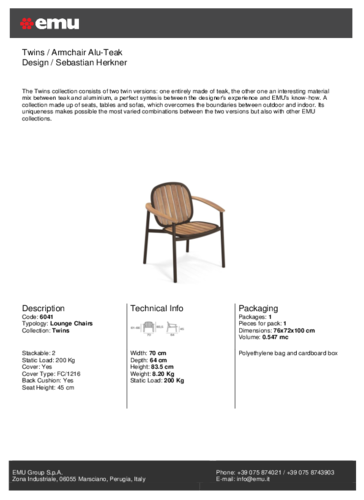 Designér Sebastian Herkner prostřednictvím židle TWINS stírá hranice mezi interiérem a exteriérem a kombinuje přímé i oblé linie. Díky odolnosti teakového dřeva a lakovaného hliníku si tento kousek poradí se všemi rozmary počasí a na terasu či zahradu vnese pořádnou dávku pohodlí i stylu. Je k dispozici v několika atraktivních barevných variantách a lze ji stohovat do dvou kusů. Pro ještě více komfortu disponuje čalouněným sedákem, který je k dostání v mnoha odstínech a materiálech. V případě potřeby ho můžete sejmout. Kolekce TWINS se skládá z modelů, které jsou celé dřevěné a sedadel kombinovaných s hliníkovou konstrukcí. Její rozmanitost umožňuje skládat jednotlivé židle a křesla podle libosti, a vytvářet tak ležérně moderní zákoutí s příjemnou atmosférou.
