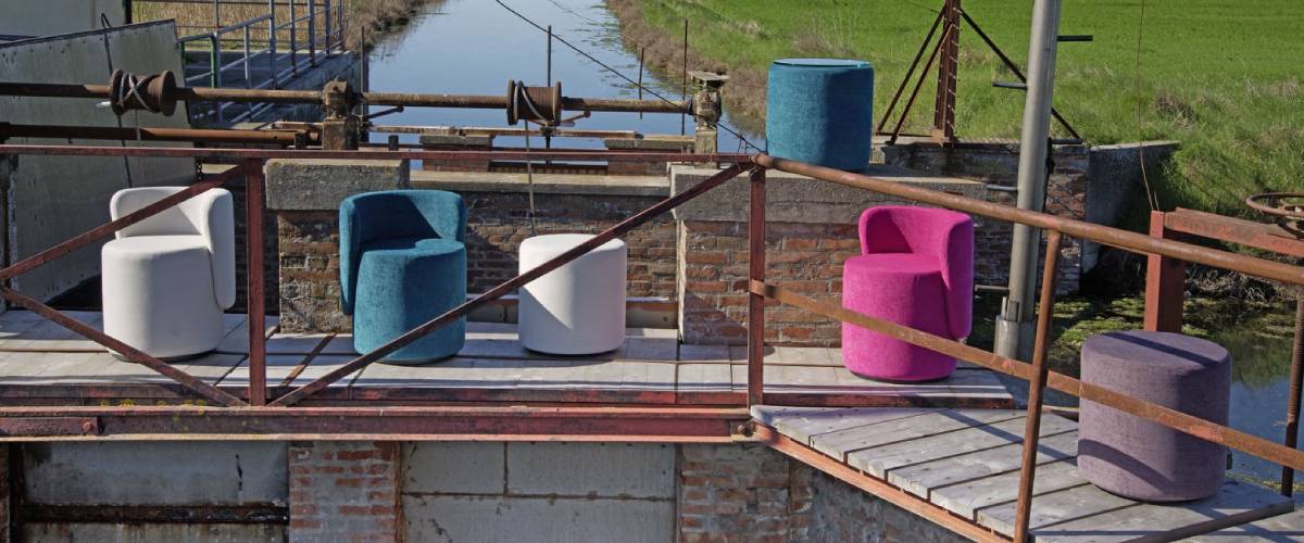 Adrenalina 's Boll collection of rounded shapes made up of smaller pieces is simple and playful. It consists of a designer armchair, a pouffe and a coffee table. The designer Simone Micheli is responsible for its exclusive design.