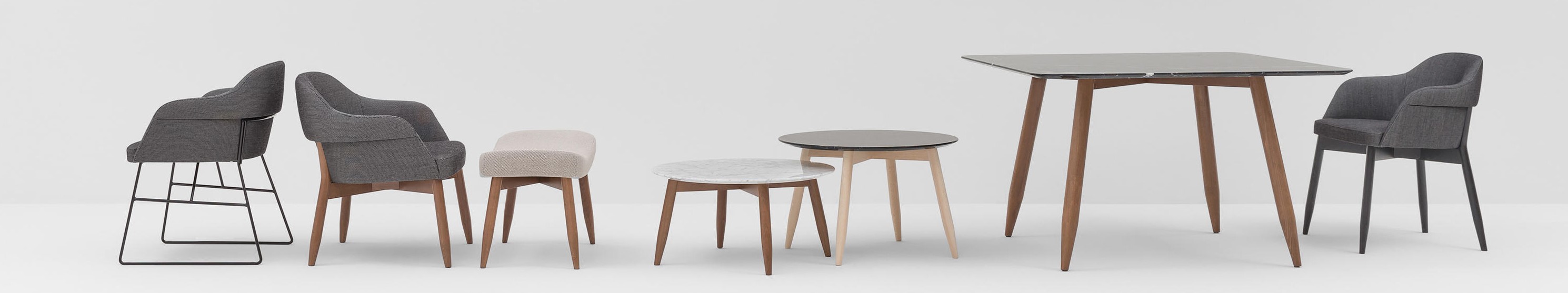 The collection features wood and steel footrest designs. Frame in stained or lacquered beech wood and upholstery in fabric, faux or genuine leather. Painted steel frame and upholstery in fabric, faux or genuine leather. Tables with stained or lacquered beech wood frame and top in lacquered mdf or white or black marble.